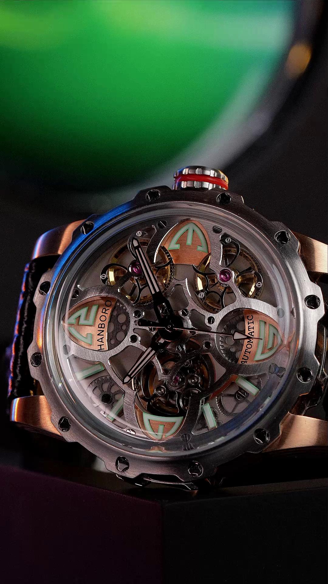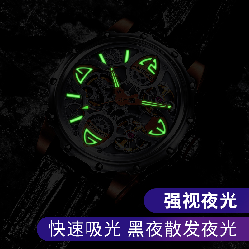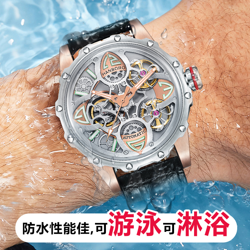 HANBORO衡宝罗全自动机械表男潮学生黑科技防水镂空正品名牌真皮带手表男8851